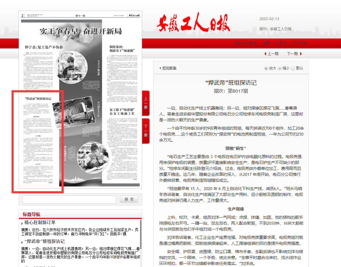 《安徽工人日报》2月13日二版:“焊武帝”班组探访记