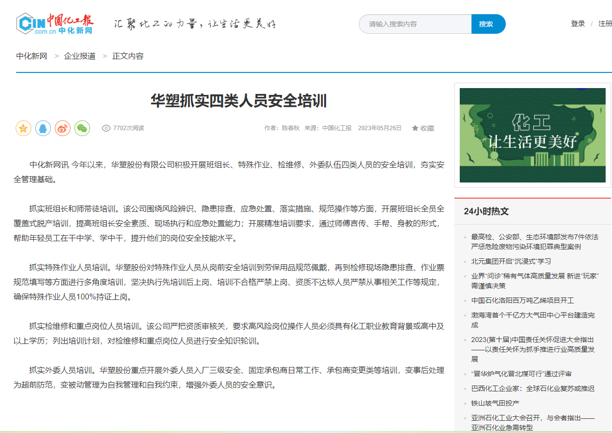 《中国化工报》5月26日四版:yd2333云顶电子游戏抓实四类人员安全培训
